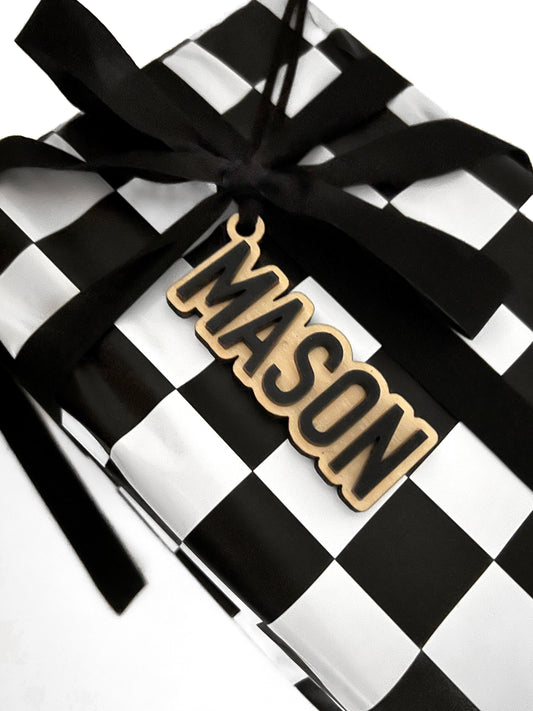 Personalized CHRISTMAS magnets, tags, & ornaments with a name in one of our fonts and any of our acrylic colors for both design and name. Available with birch wood or clear acrylic backing and choice of chiffon ribbon or suede cord for tags and ornaments.