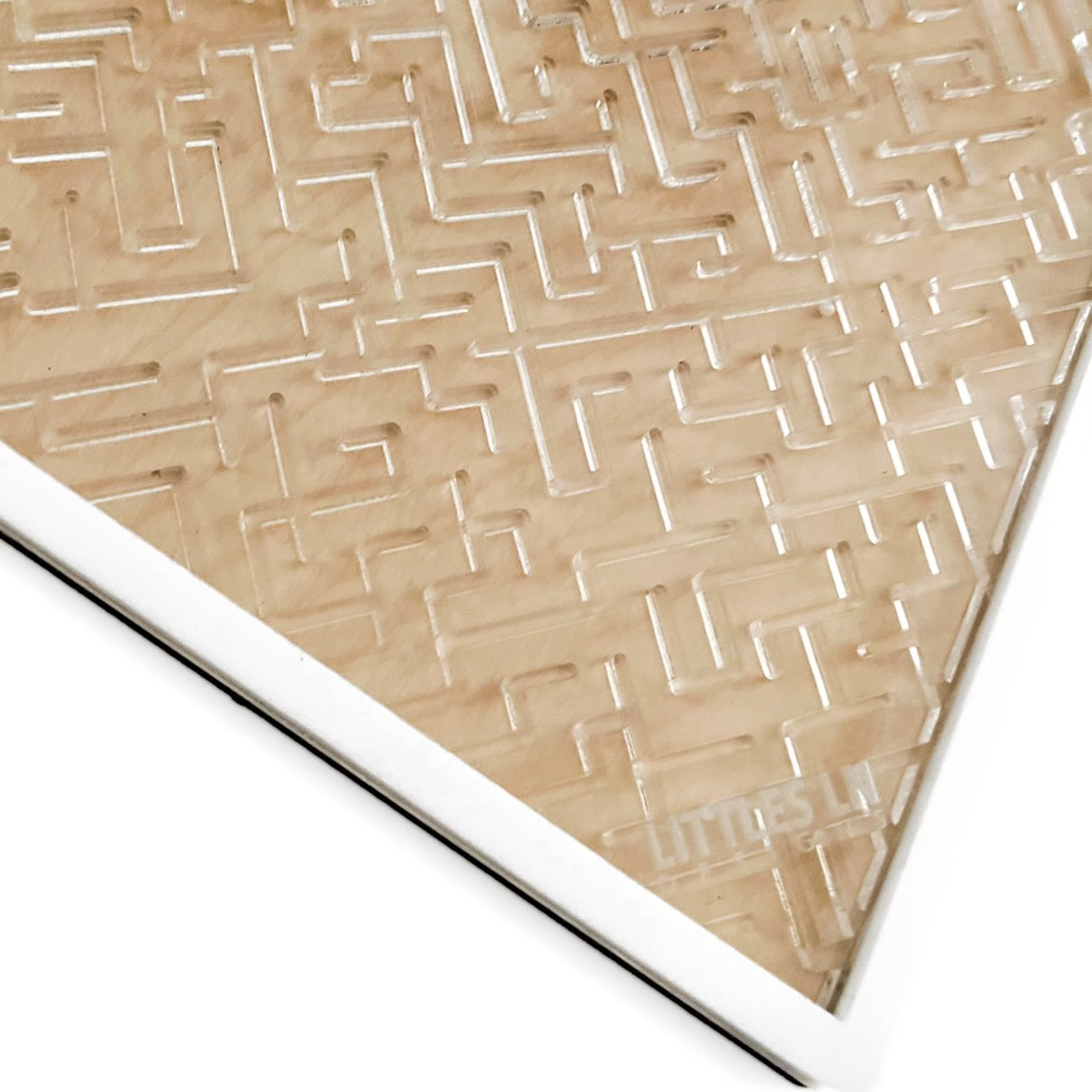 - Layered tilt maze, laser-cut from ¼" birch backing, ⅛" clear gloss acrylic with laser-cut maze design, ⅛" clear gloss acrylic top, and ⅛" gloss acrylic heart design.