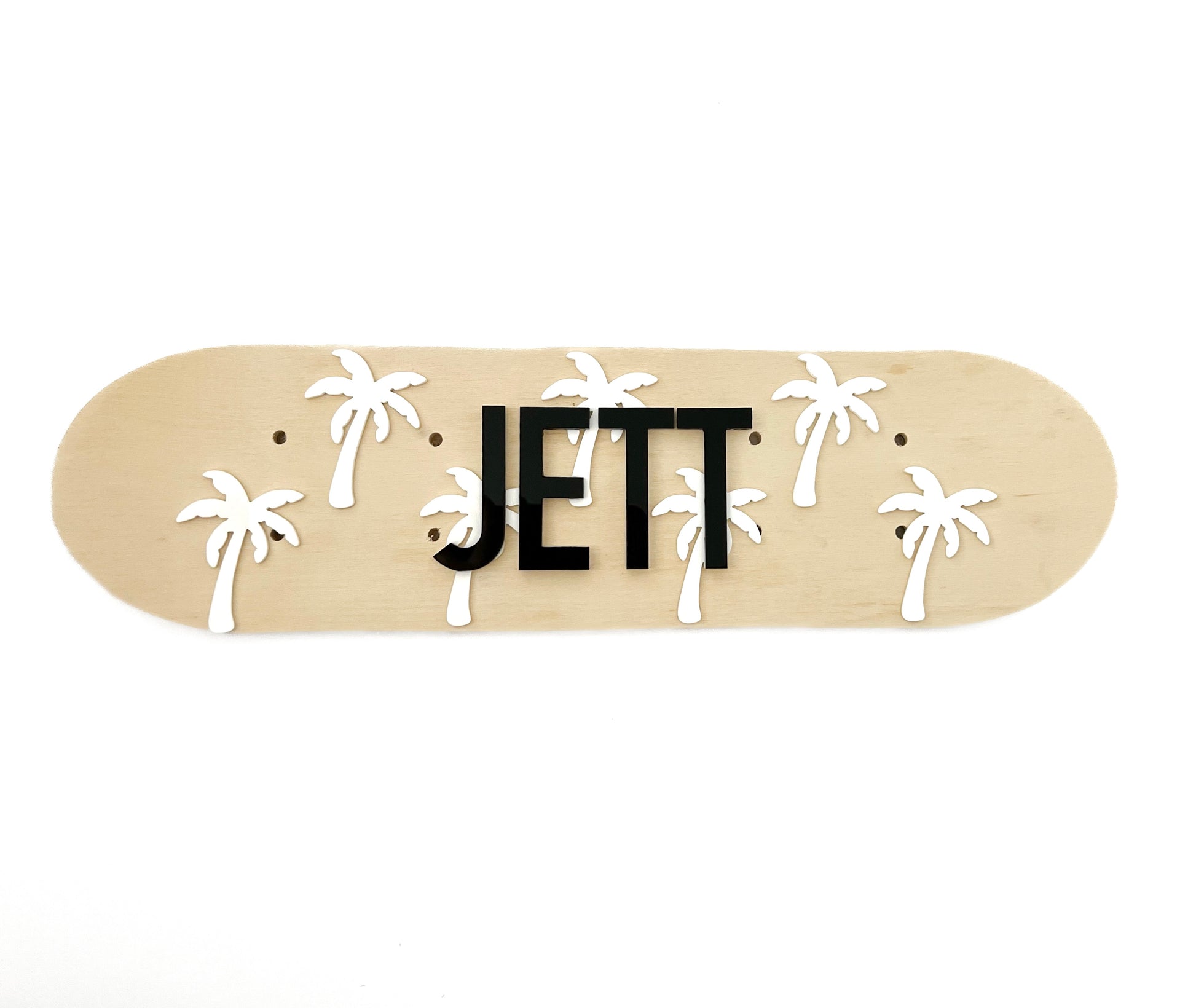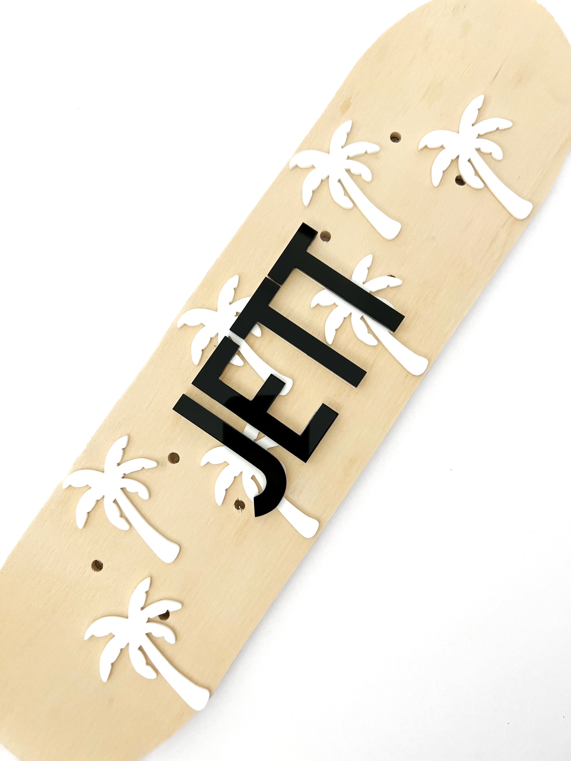 - Layered wall decor, laser-cut from two layers of ⅛" cast gloss acrylic and applied to top of a REAL mini skateboard deck.