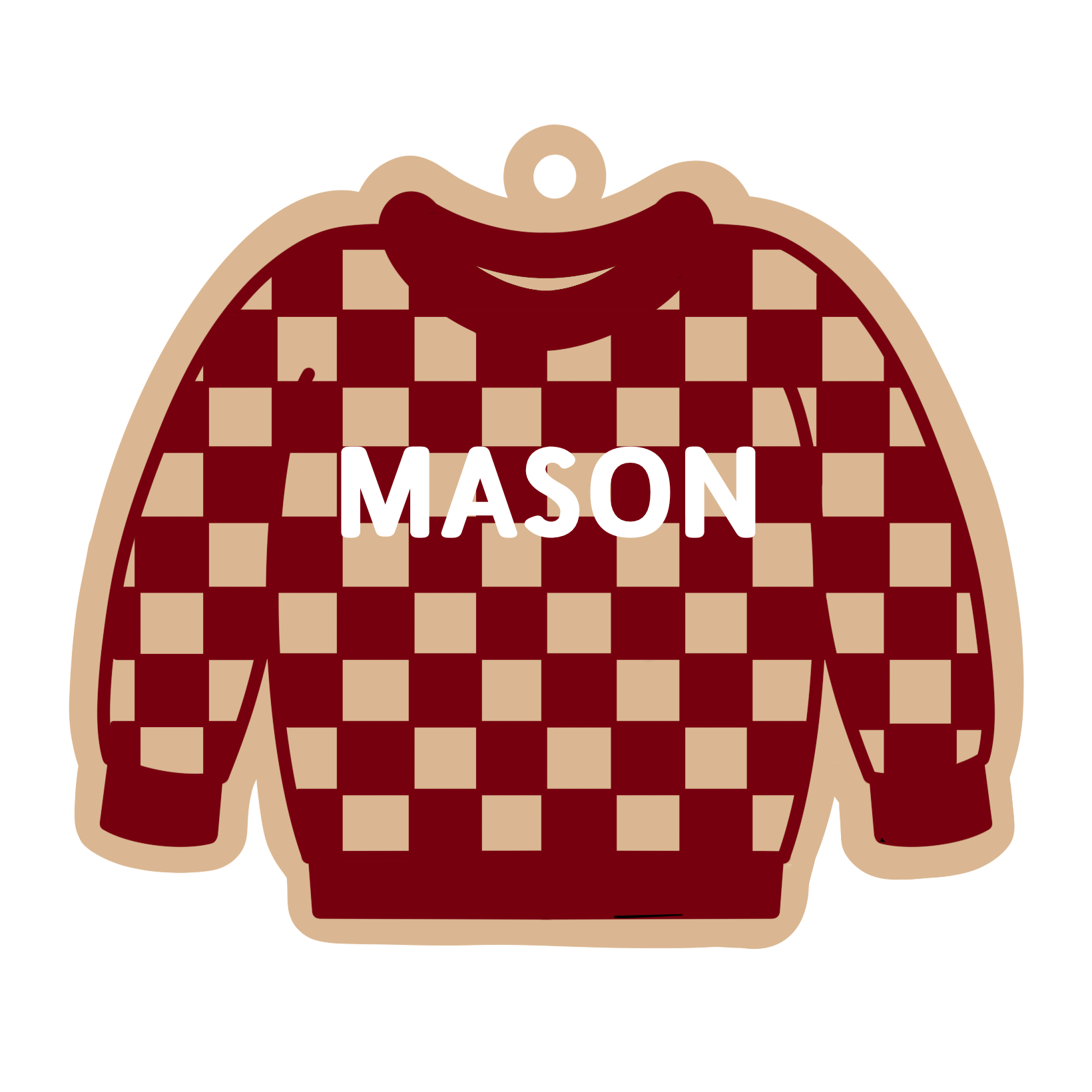 - Personalized CHECK SWEATER with a name in one of our fonts and any of our acrylic colors for both sweater and name. Birch wood or clear acrylic backing.