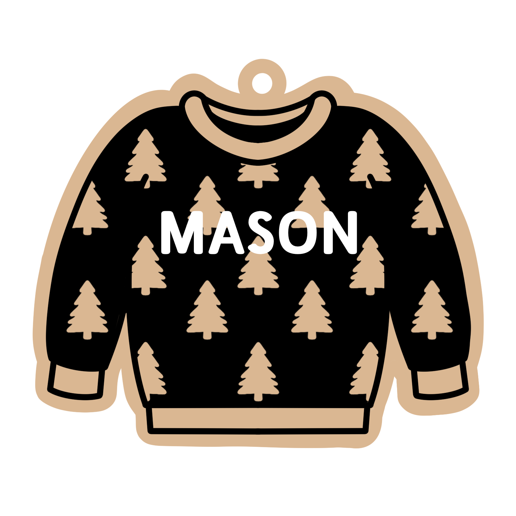 - Personalized TREES SWEATER with a name in one of our fonts and any of our acrylic colors for both sweater and name. Birch wood or clear acrylic backing.